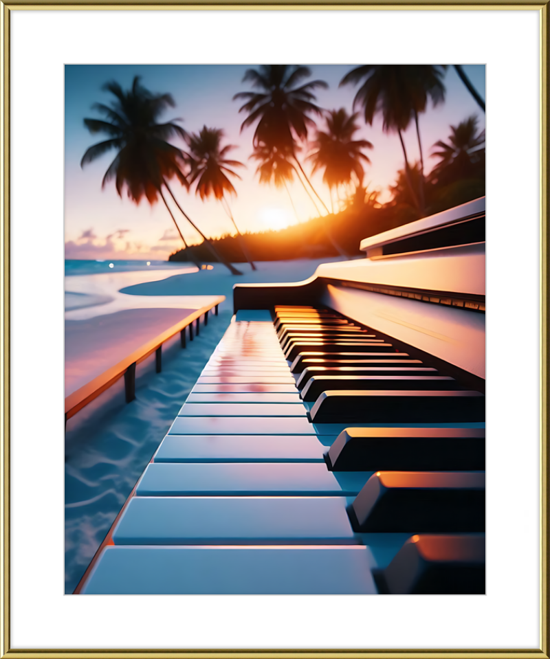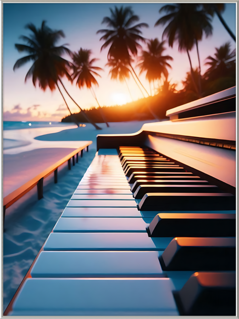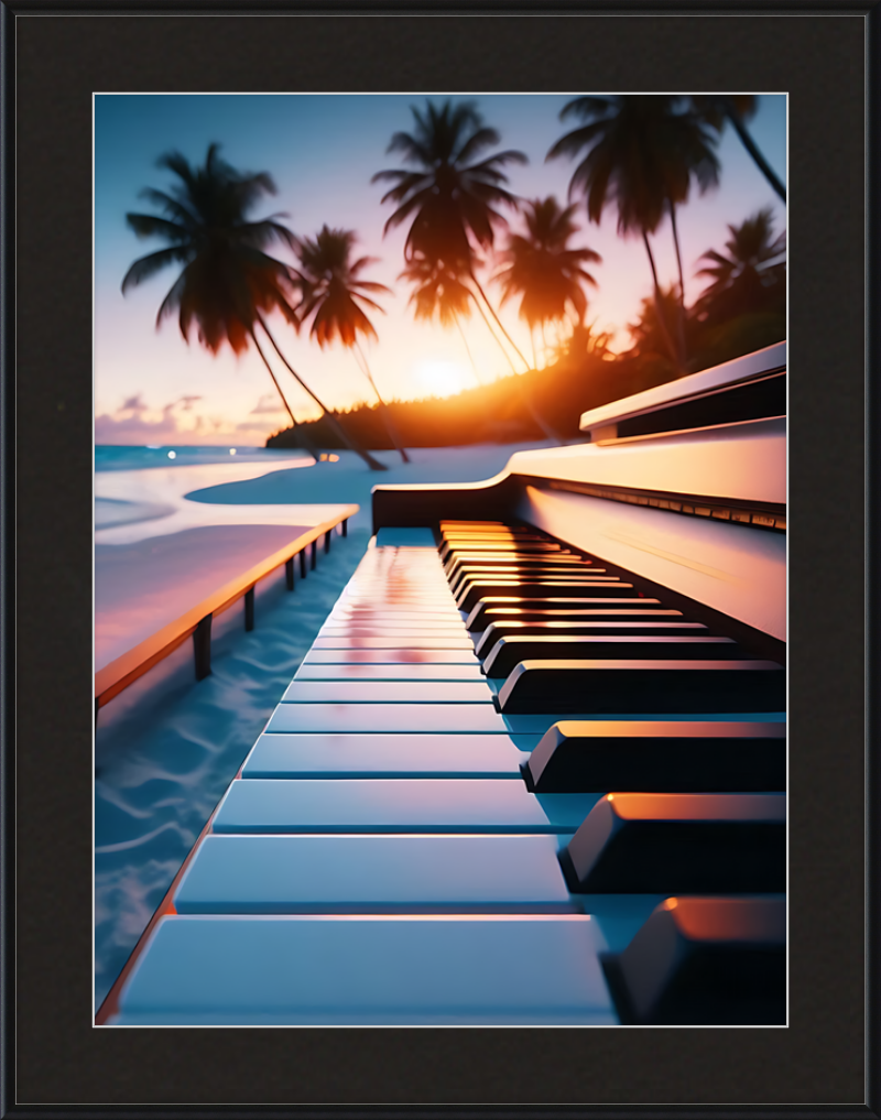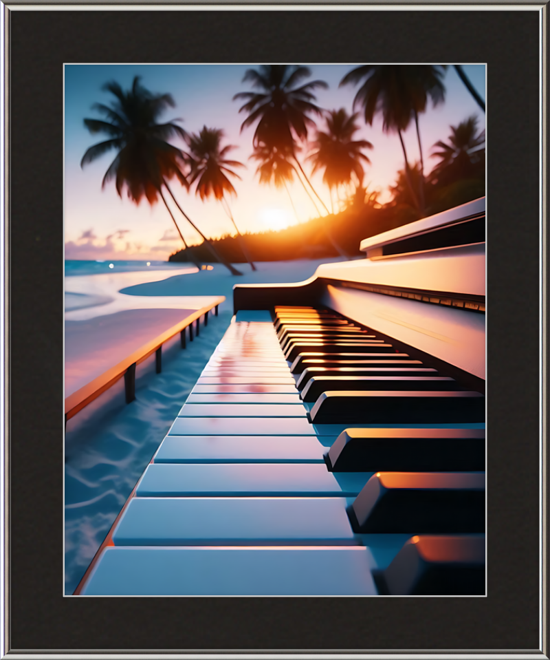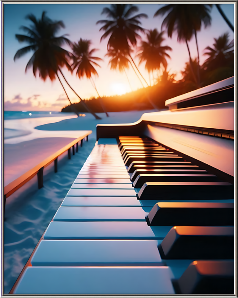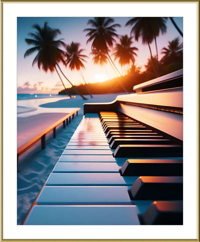This enchanting print seamlessly blends music and nature. The foreground features a piano keyboard, its keys extending infinitely toward the horizon. In the background, a tropical paradise unfolds—a pristine beach bathed in warm sunset hues, with palm trees silhouetted against the sky. The composition evokes emotions of peace and wonder, inviting viewers to appreciate life’s harmonious symphony where creativity meets stillness.