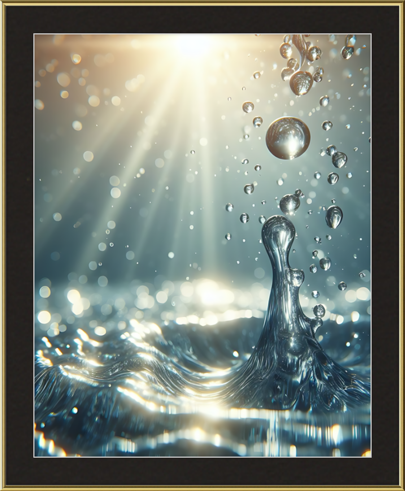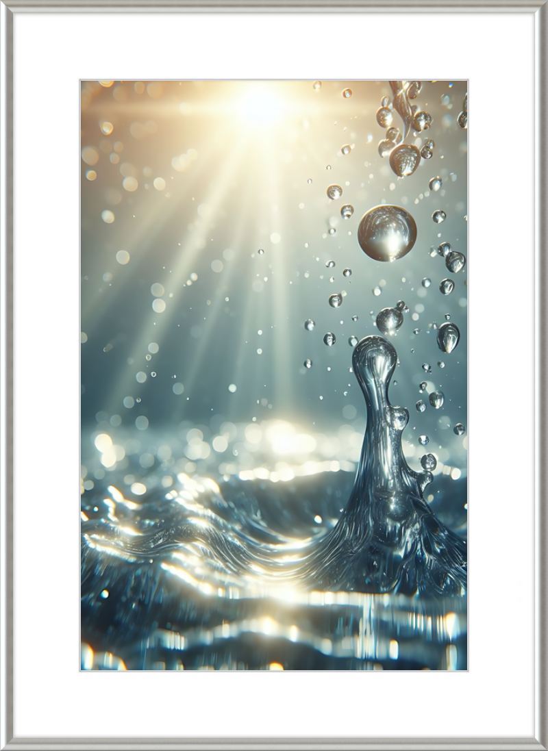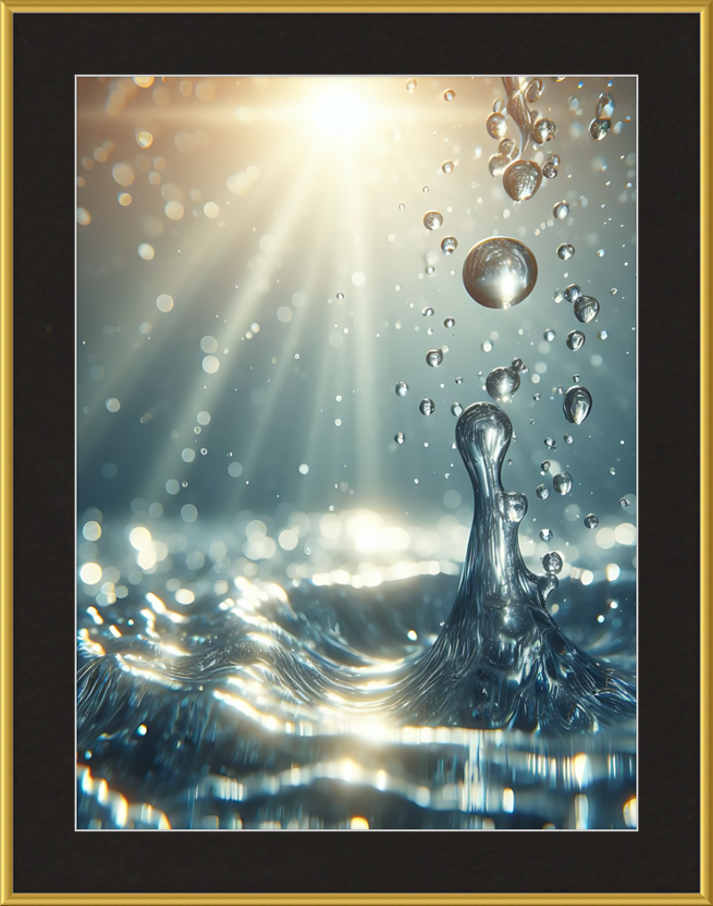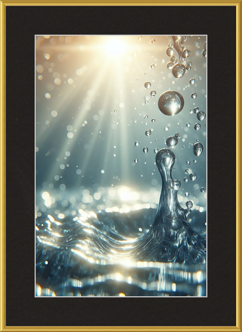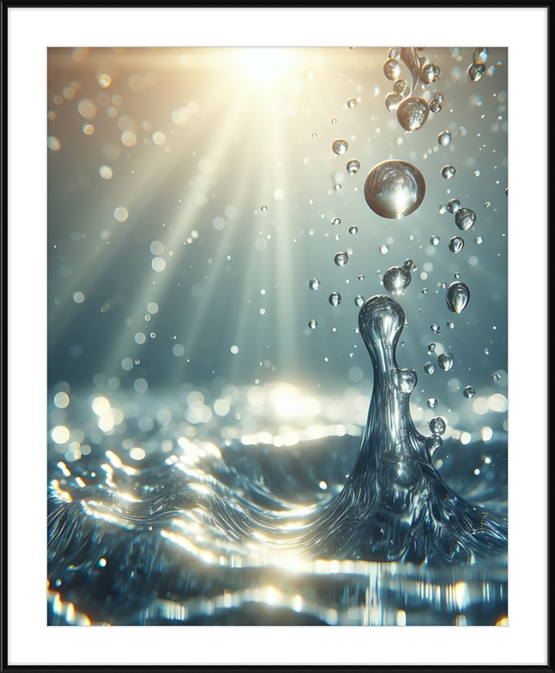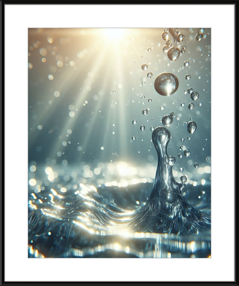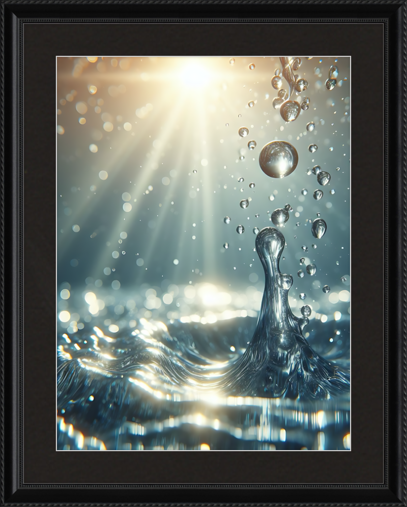 This stunning print captures a moment of liquid choreography—a dance of bubbles and light. A central splash rises, frozen in time, resembling delicate glass. Droplets cling to its edges, refracting sunlight. Shadows ripple across the water, creating an ethereal glow.