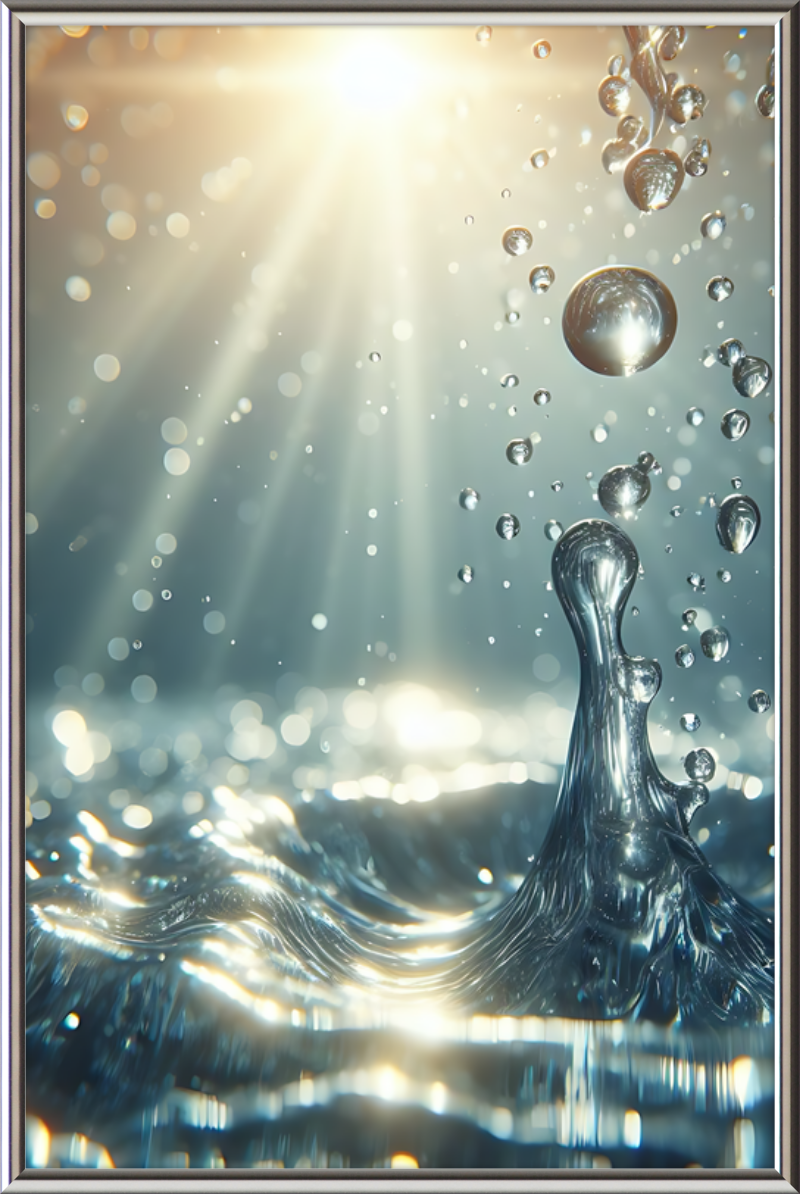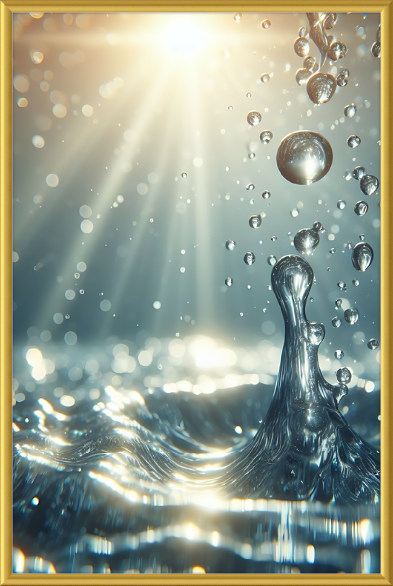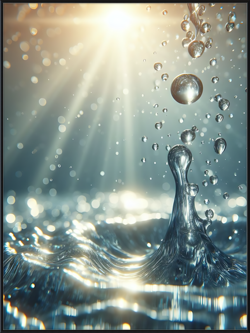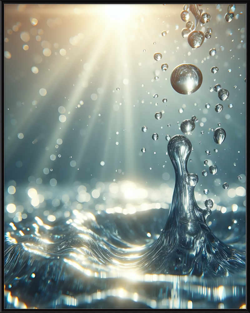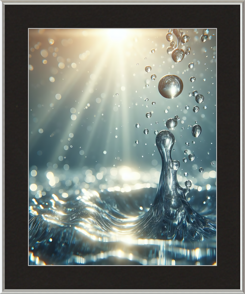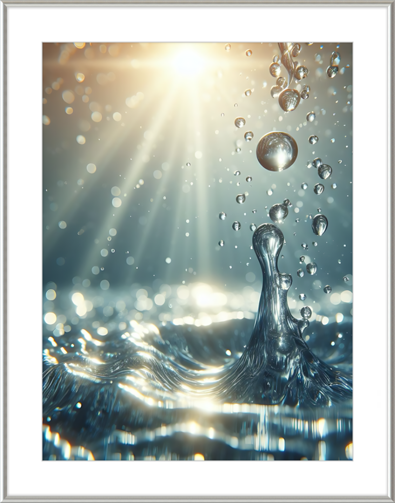 This stunning print captures a moment of liquid choreography—a dance of bubbles and light. A central splash rises, frozen in time, resembling delicate glass. Droplets cling to its edges, refracting sunlight. Shadows ripple across the water, creating an ethereal glow.
