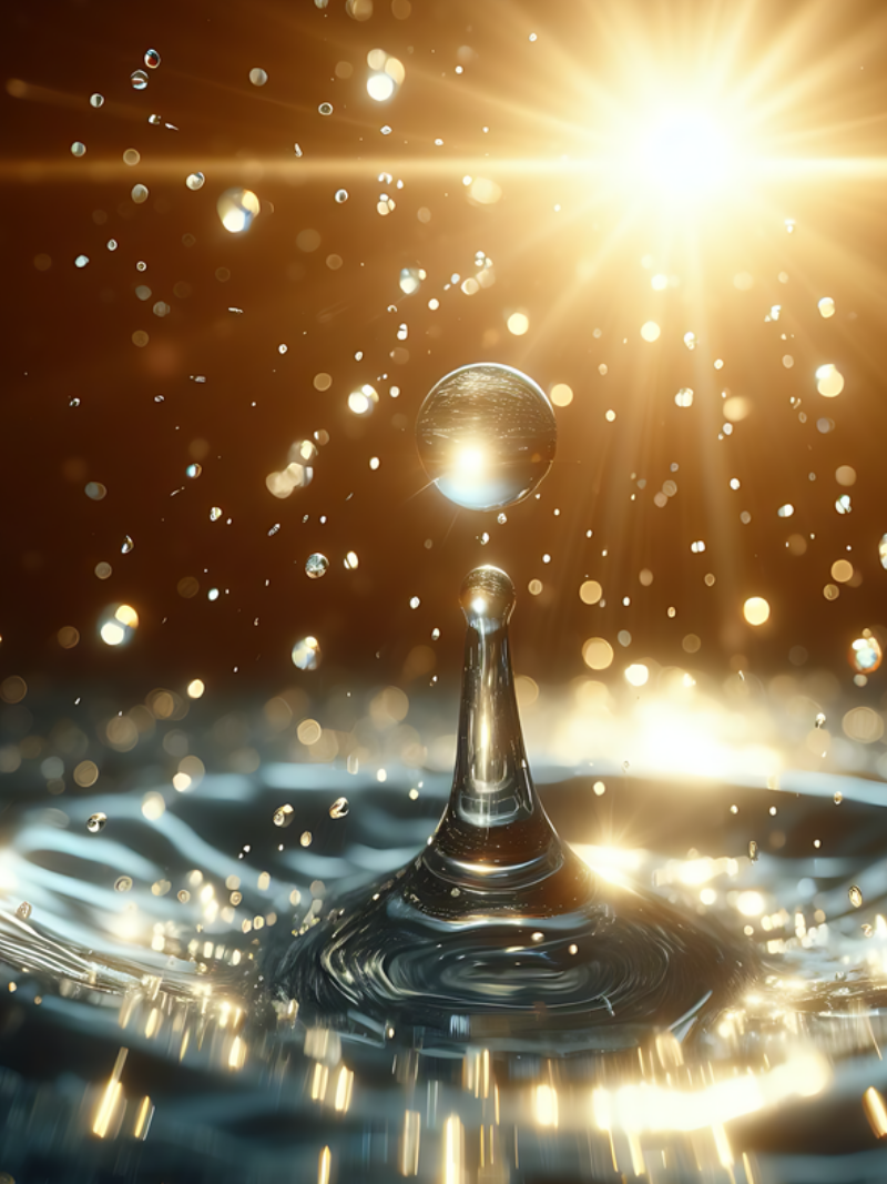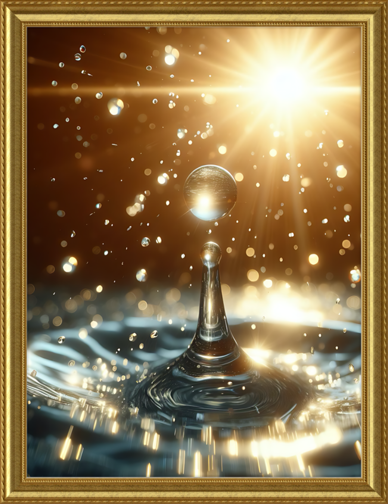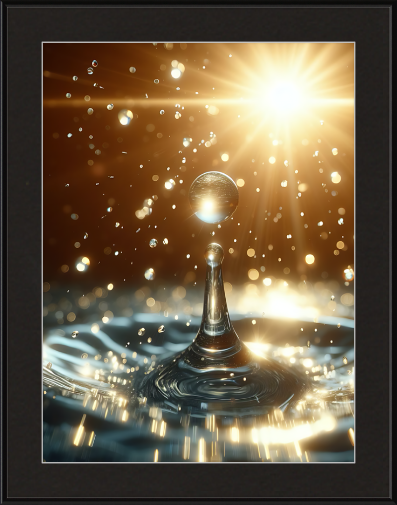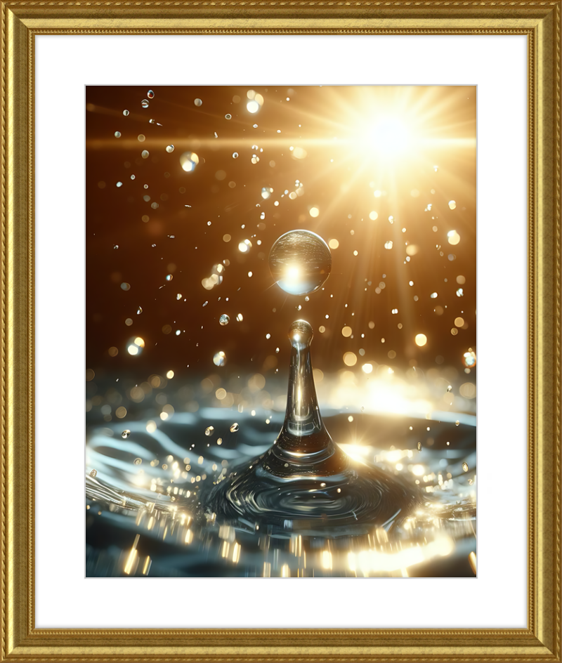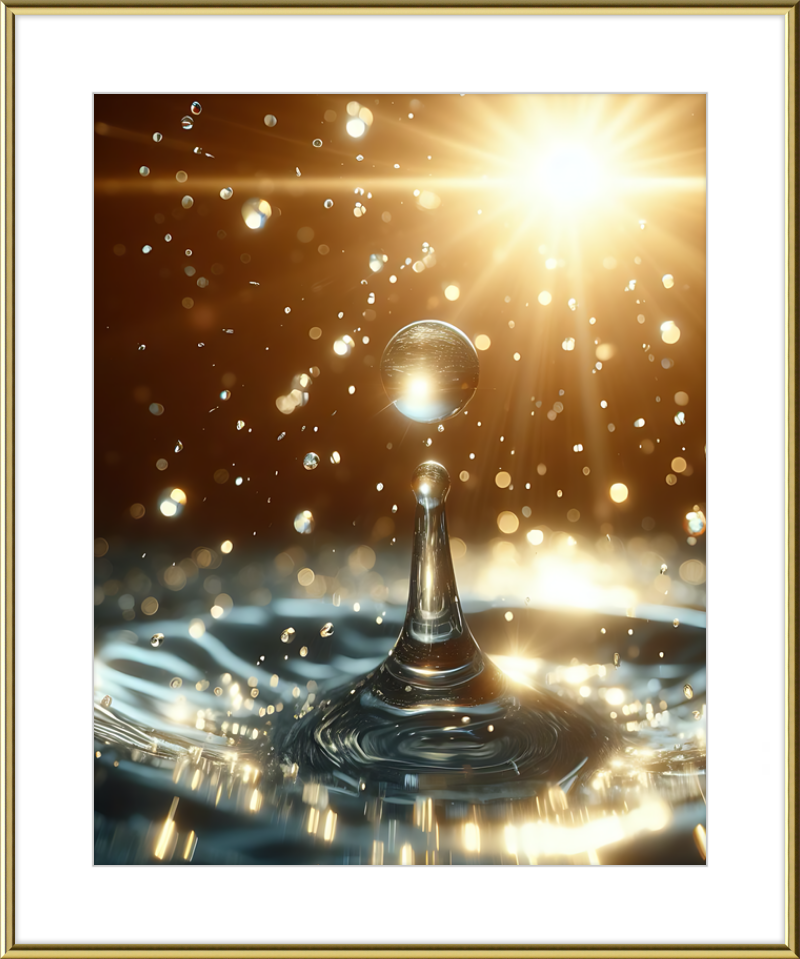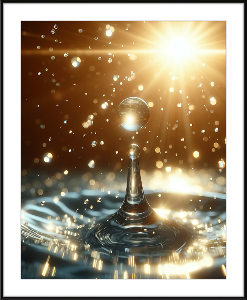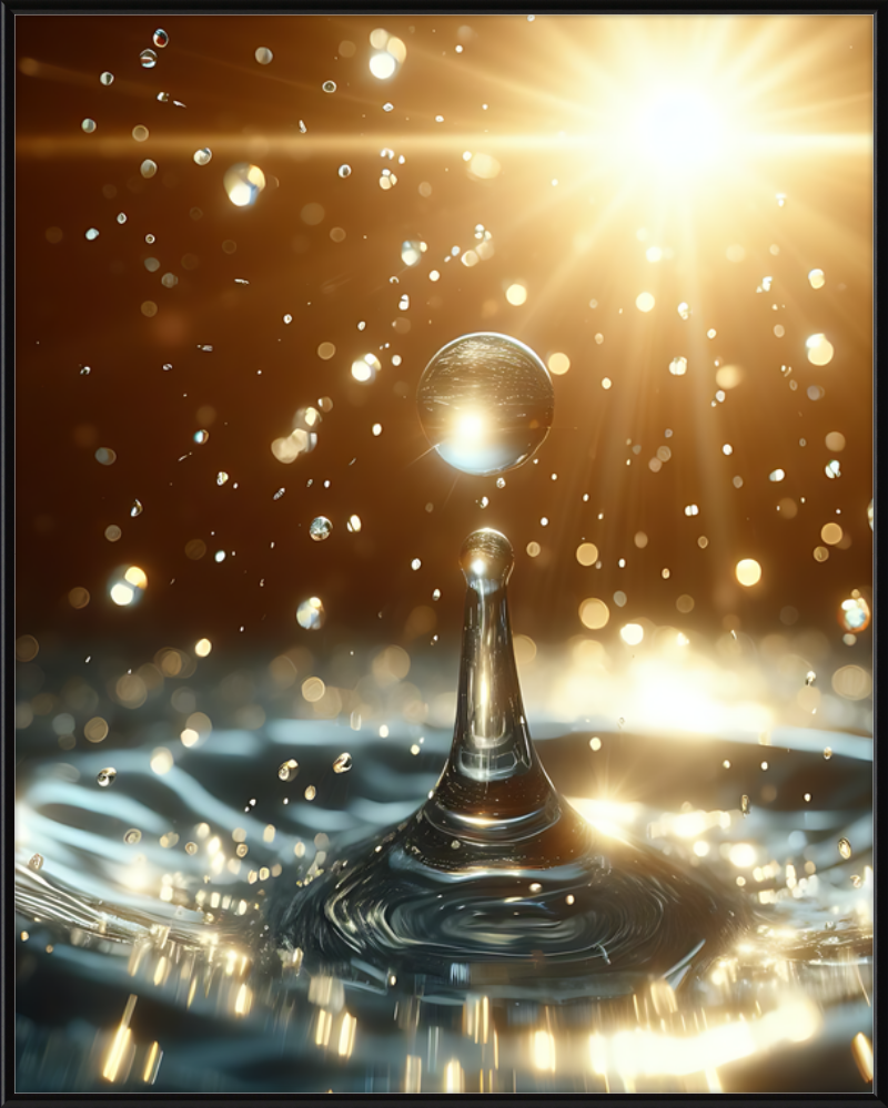 Immerse yourself in the mesmerizing world of fluid dynamics with this striking print. Suspended in time, a water droplet dances mid-splash, its intricate details frozen for eternity. The radiant sunlight in the background creates a captivating effect, adding depth and intrigue to this stunning piece. A perfect addition to any art collection.