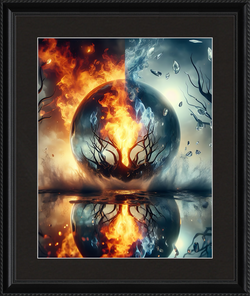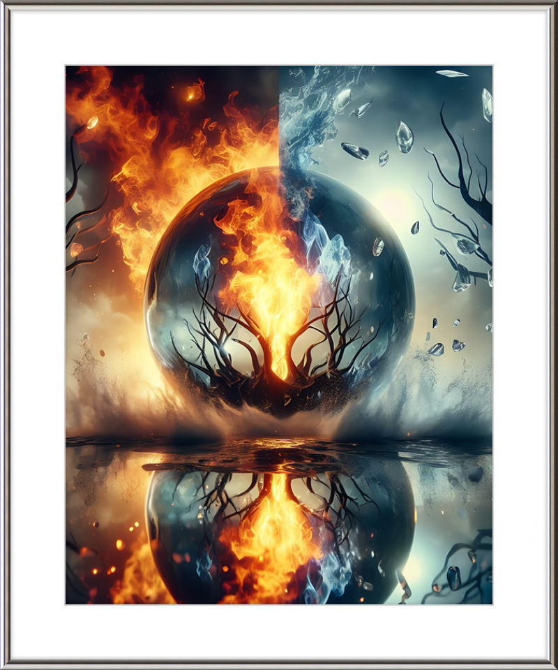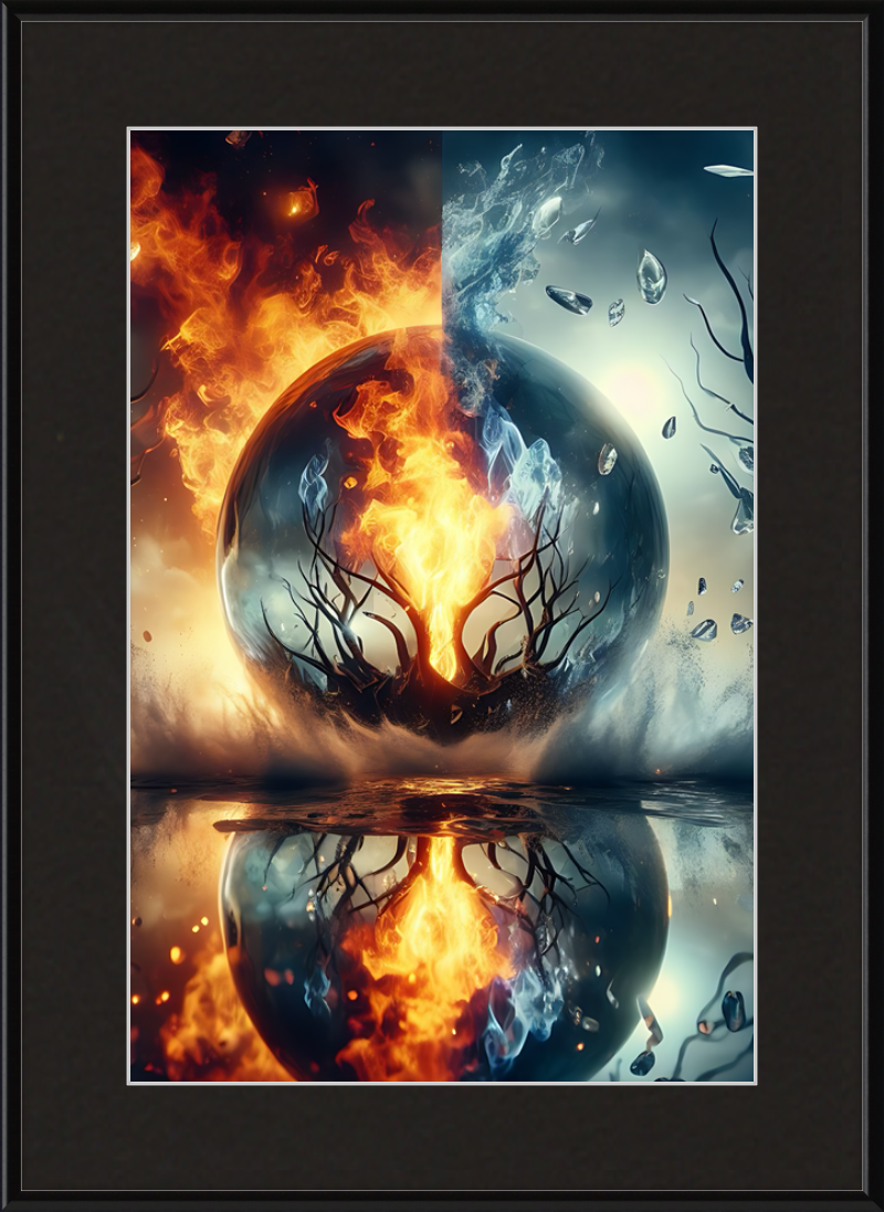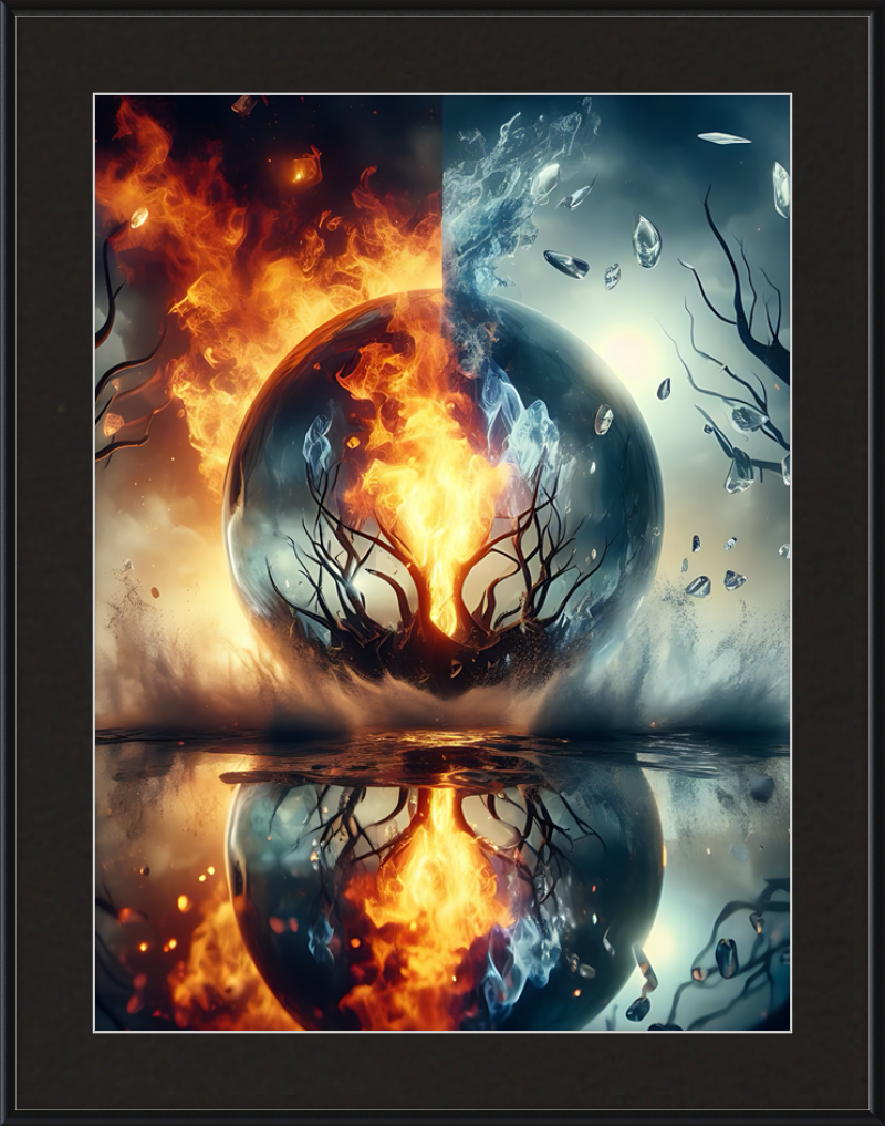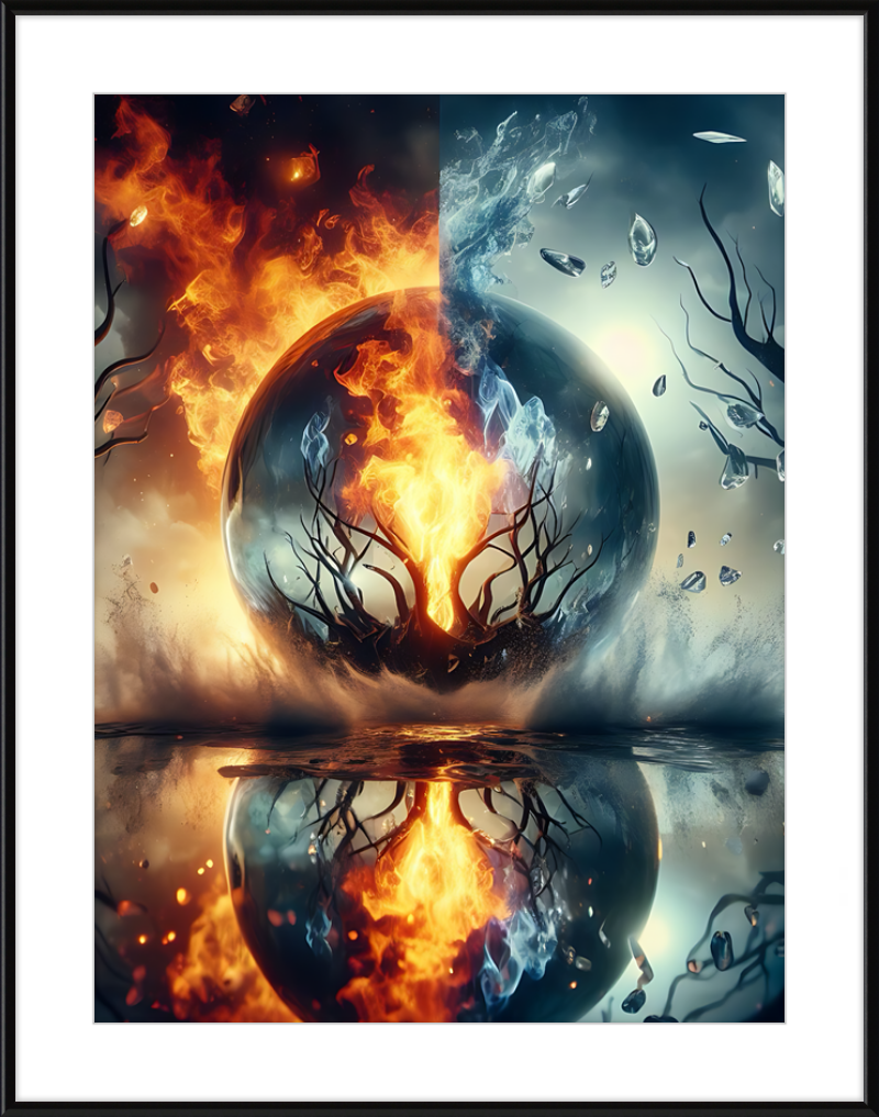 This mesmerizing print captures a cosmic clash of elements. Reflective waters mirror a central tree ablaze within a magical sphere. Fire and ice swirl in harmonious opposition, evoking both wonder and contemplation.