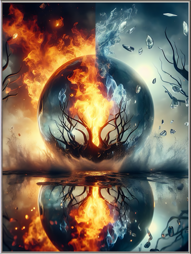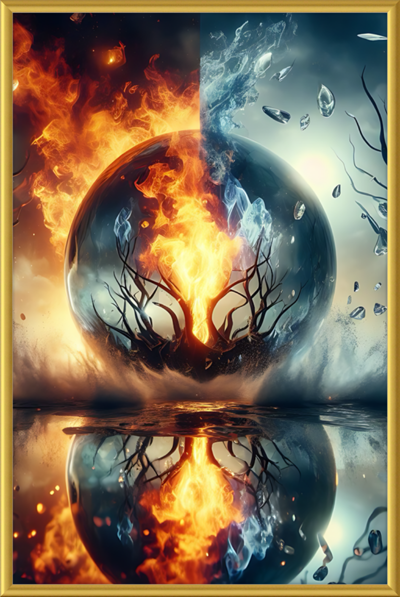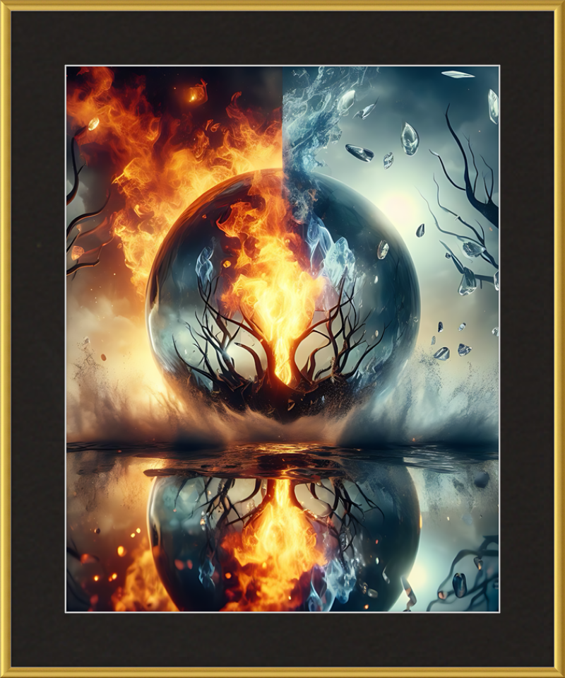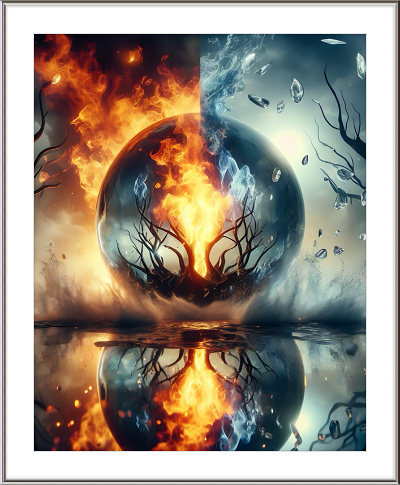 This mesmerizing print captures a cosmic clash of elements. Reflective waters mirror a central tree ablaze within a magical sphere. Fire and ice swirl in harmonious opposition, evoking both wonder and contemplation.