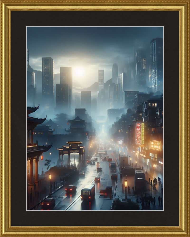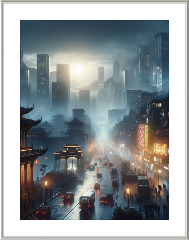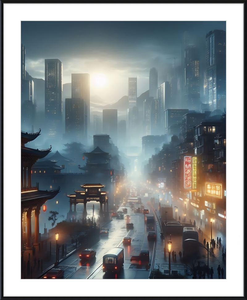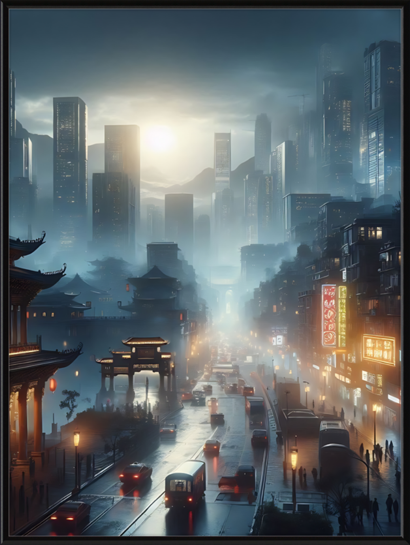 This captivating print is a blend of tradition and modernity. At dusk or during a rainy evening, we see traditional architecture in the foreground—elegant curved roofs and wooden structures—evoking history and culture.