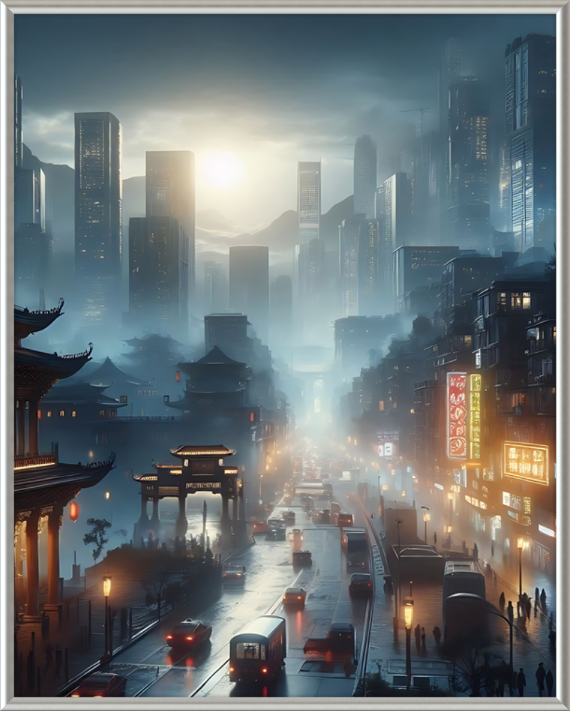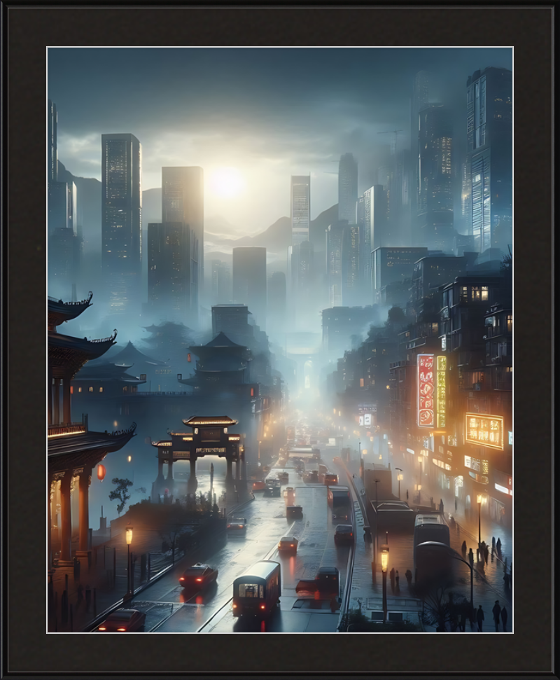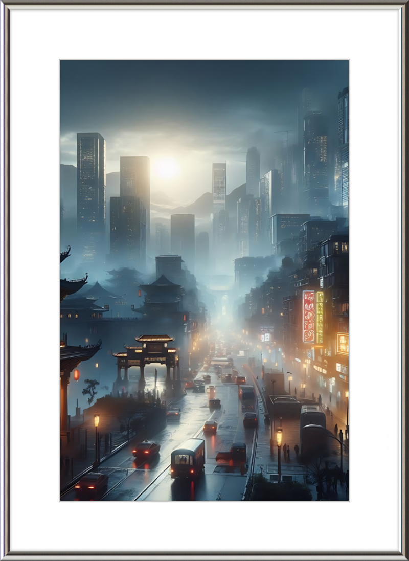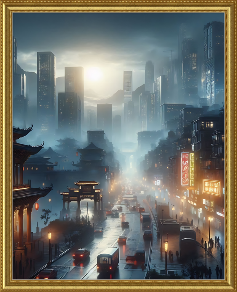 This captivating print is a blend of tradition and modernity. At dusk or during a rainy evening, we see traditional architecture in the foreground—elegant curved roofs and wooden structures—evoking history and culture.