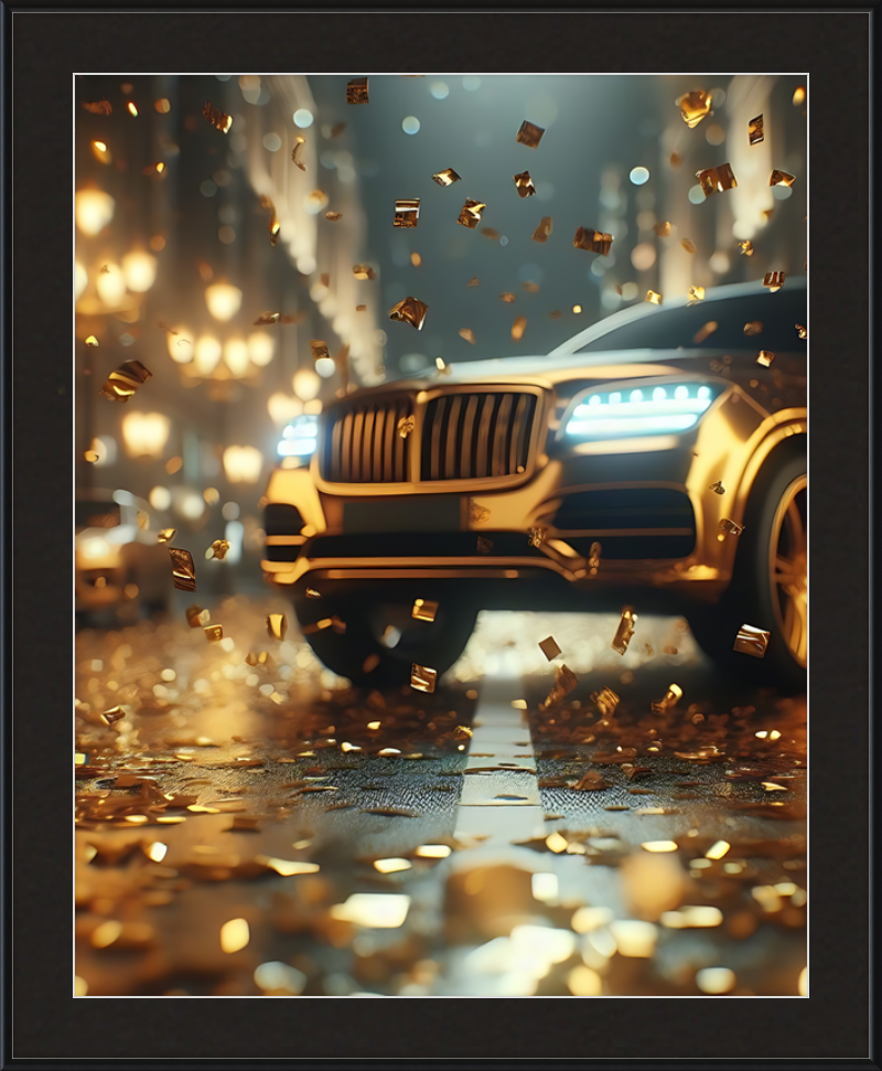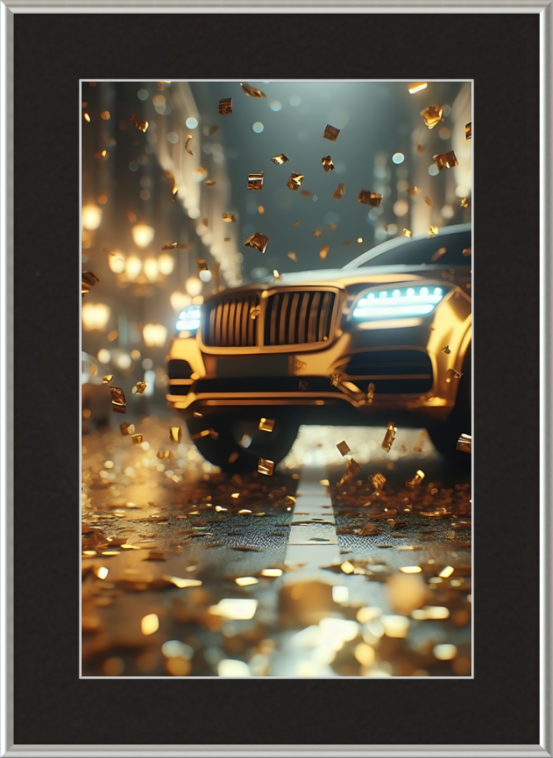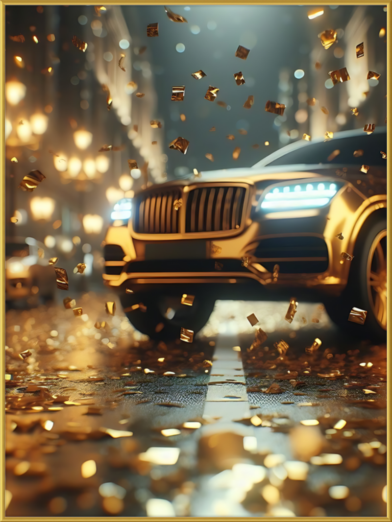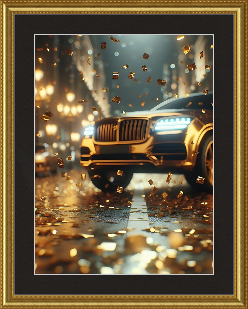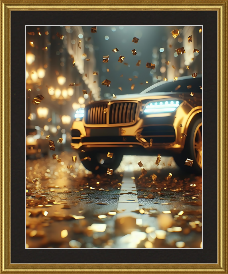 This luxurious print whispers secrets of achievement and ambition. a sleek, aerodynamic marvel takes center stage. Its lines, like strokes of destiny, trace a path to greatness. The car's body gleams, adorned with illuminated accents. Each curve signifies resilience, innovation, and the pursuit of excellence. Each golden particle carries the weight of dreams fulfilled, milestones crossed, and audacity rewarded. The confetti dances around the car, celebrating victories won and those yet to come.