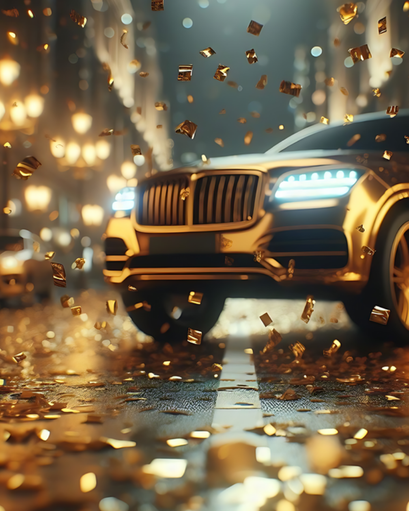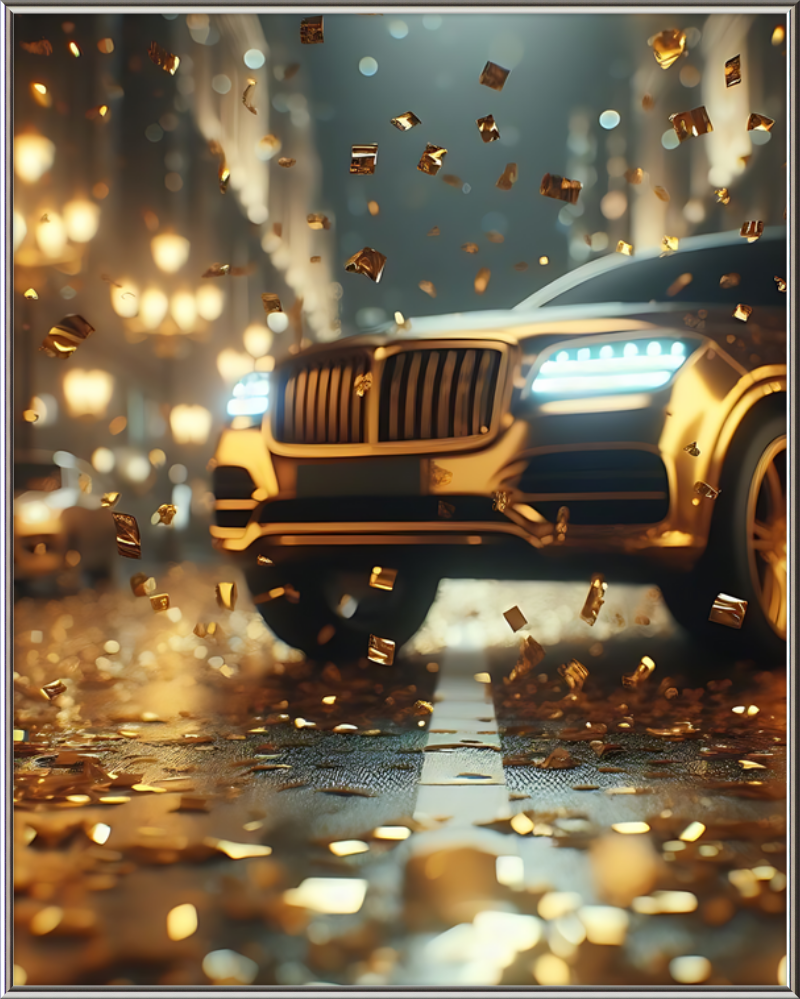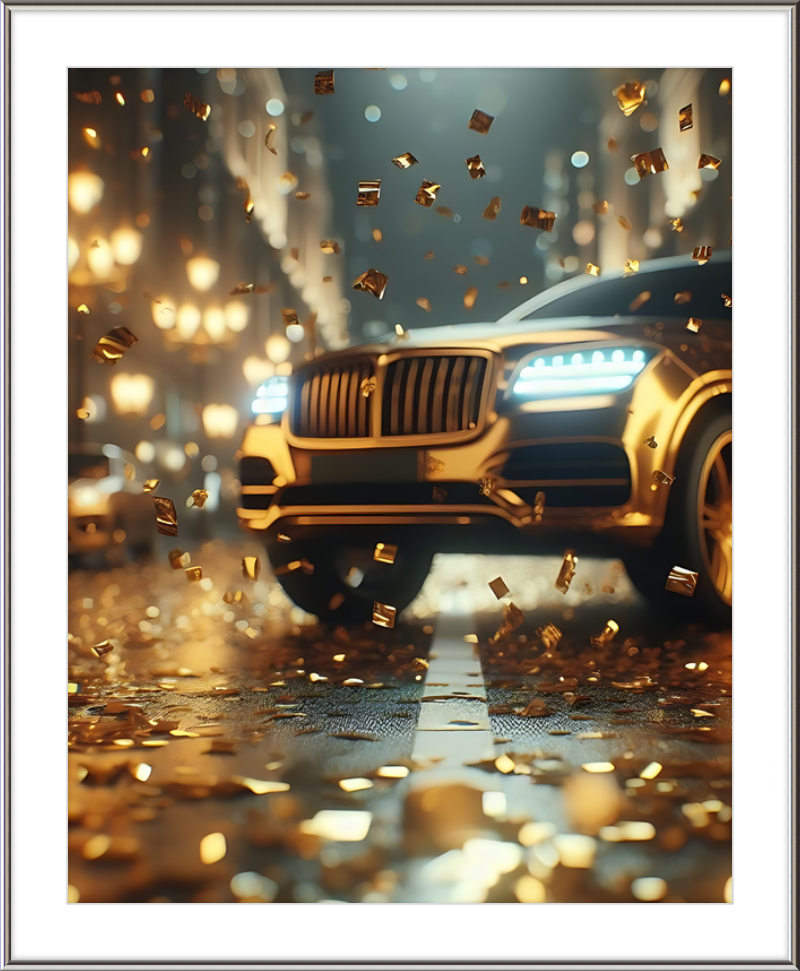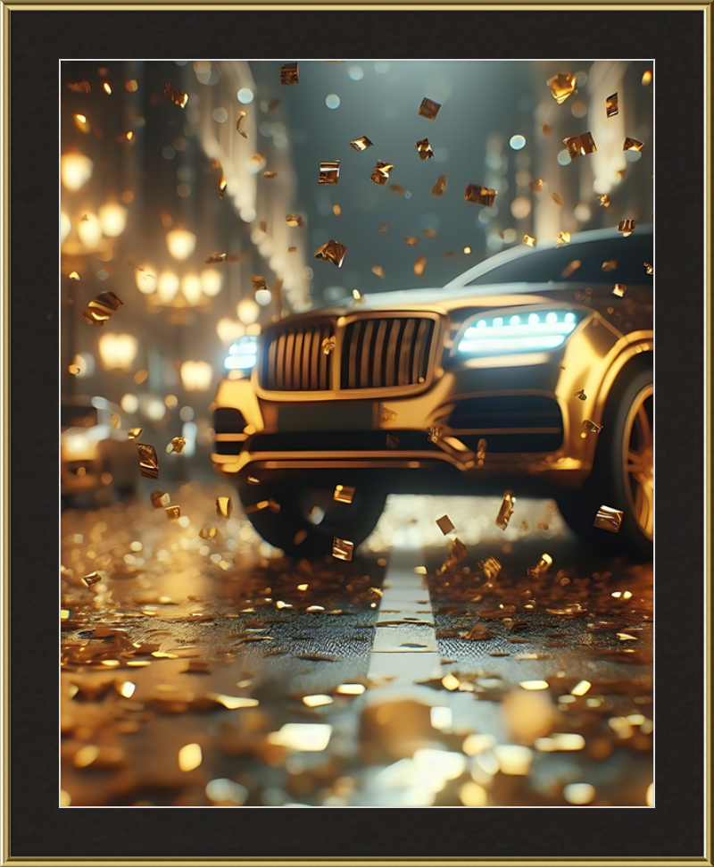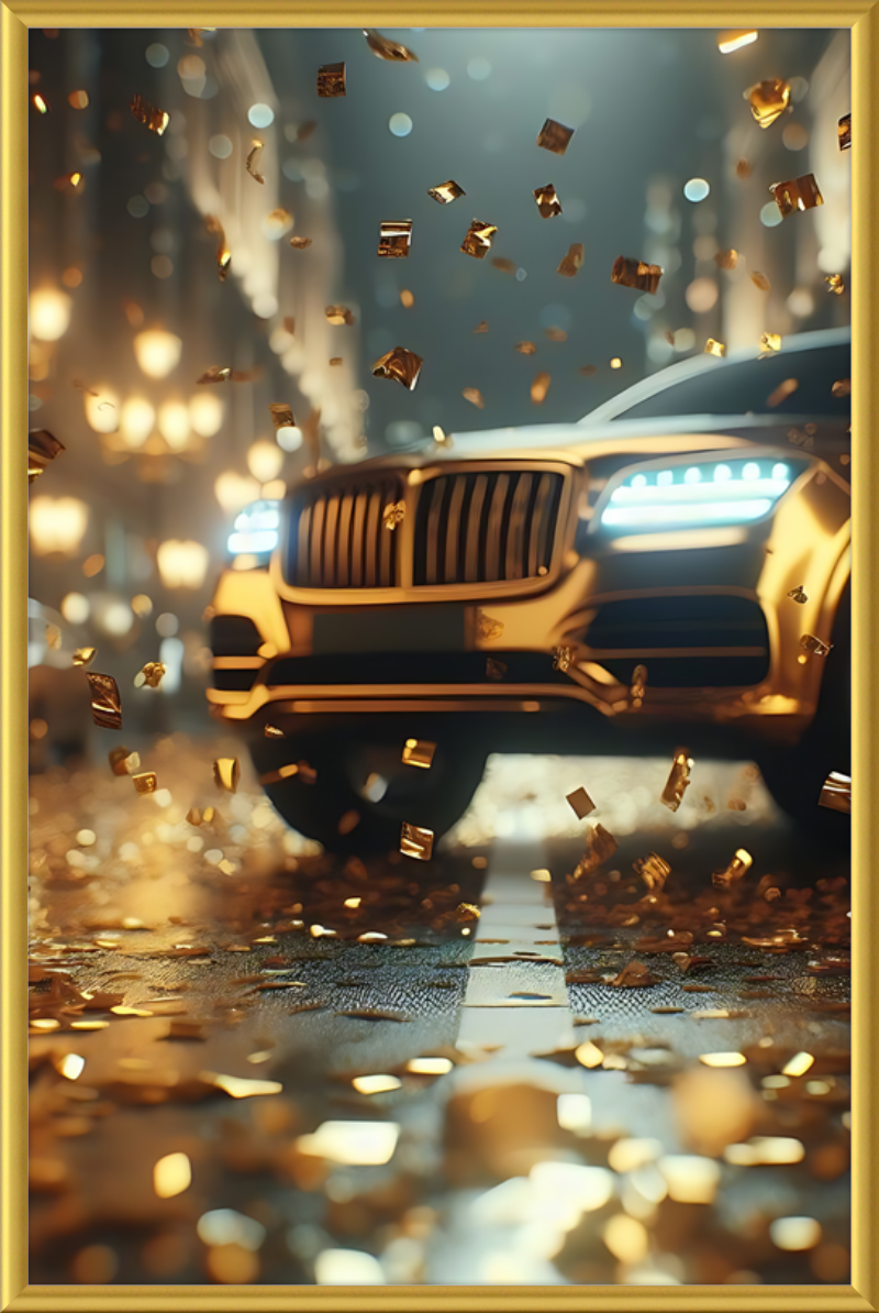 This luxurious print whispers secrets of achievement and ambition. a sleek, aerodynamic marvel takes center stage. Its lines, like strokes of destiny, trace a path to greatness. The car's body gleams, adorned with illuminated accents. Each curve signifies resilience, innovation, and the pursuit of excellence. Each golden particle carries the weight of dreams fulfilled, milestones crossed, and audacity rewarded. The confetti dances around the car, celebrating victories won and those yet to come.