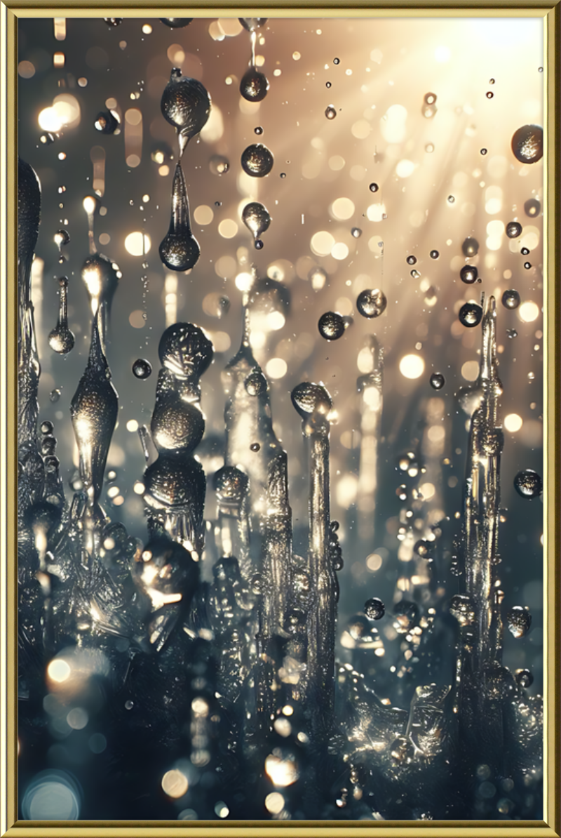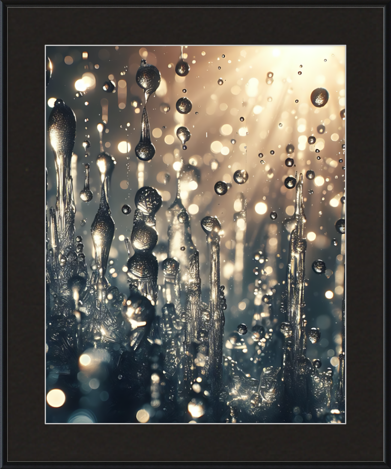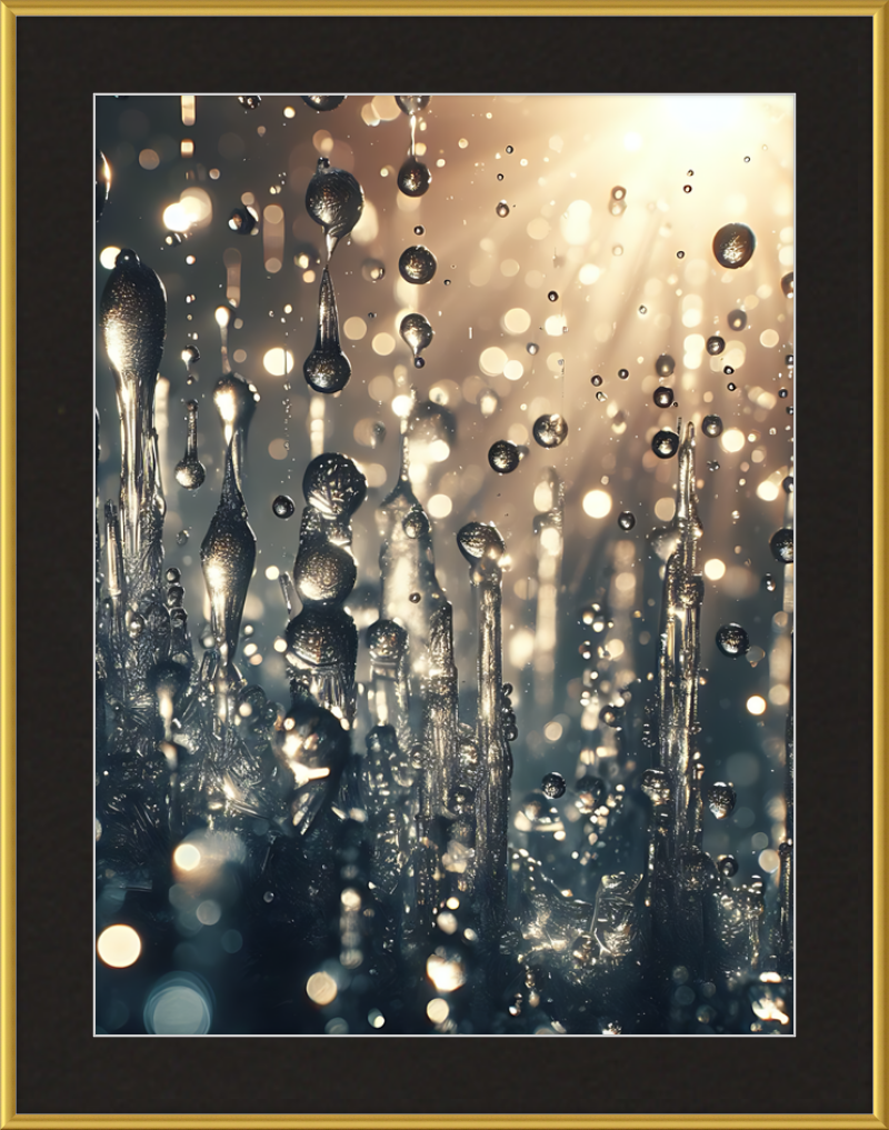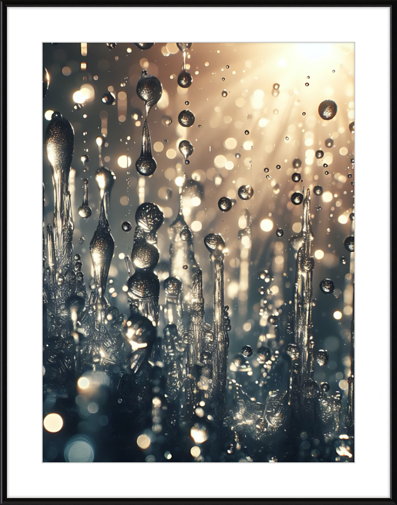 This print captures a captivating scene of countless water droplets, suspended in mid-air, illuminated by a warm, radiant light that imparts an ethereal quality to the entire composition. The droplets, varying in size and shape, create a dynamic pattern that evokes images of a bustling cityscape of crystalline skyscrapers or an alien landscape. The interplay of light and shadow adds depth to the image, emphasizing the uniqueness of each droplet while also integrating them into a cohesive tapestry of natural wonder.