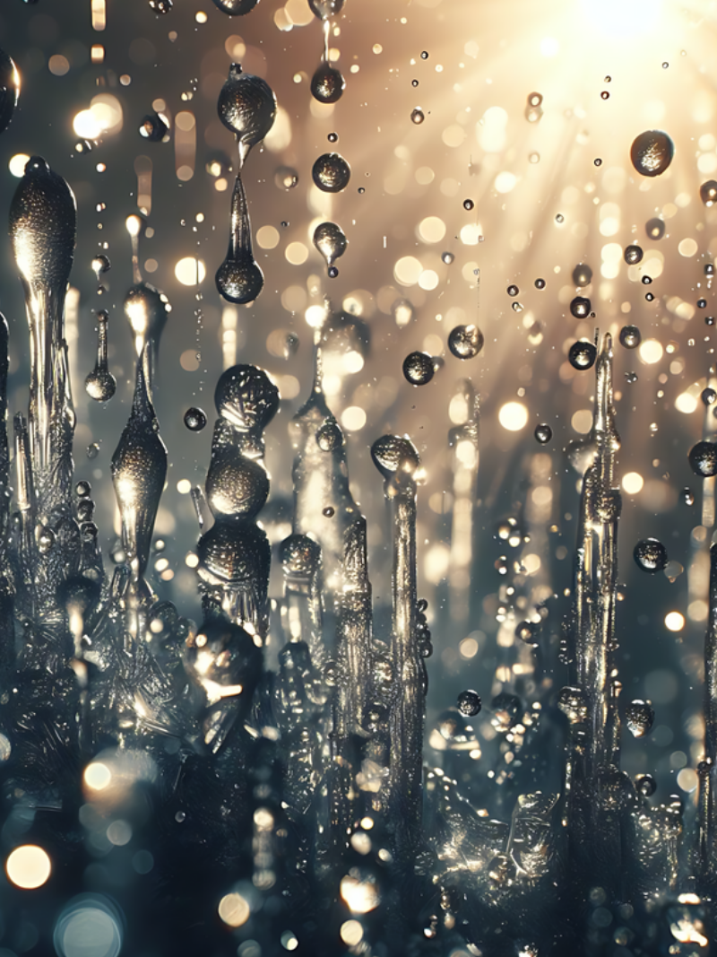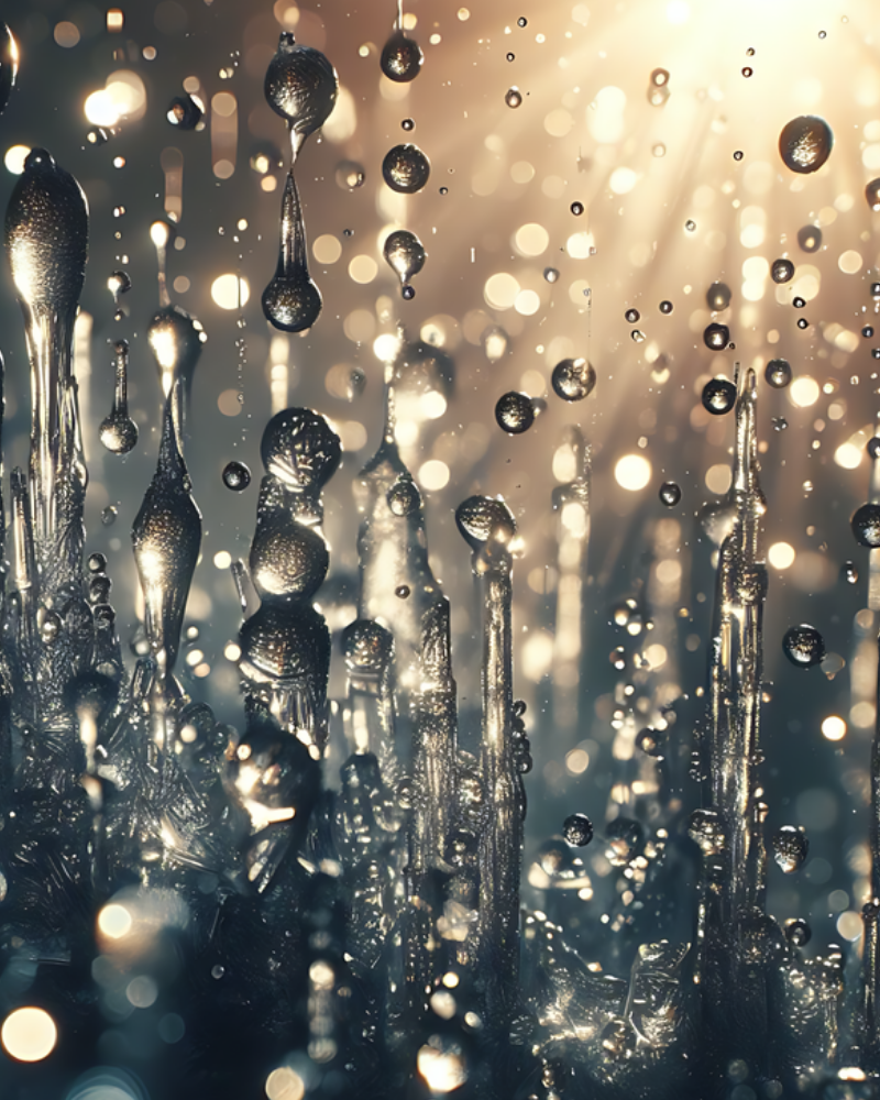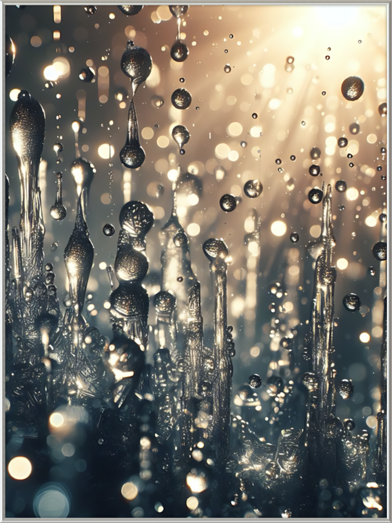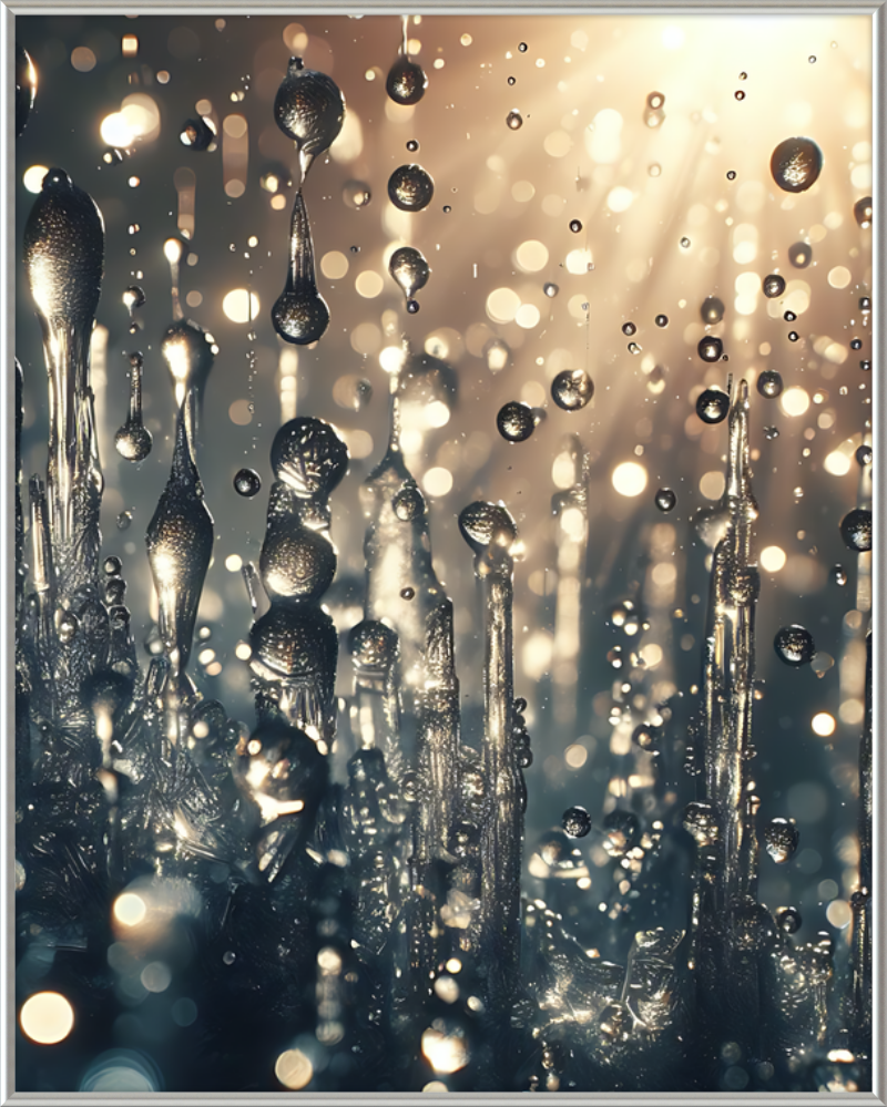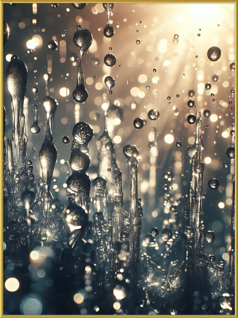This print captures a captivating scene of countless water droplets, suspended in mid-air, illuminated by a warm, radiant light that imparts an ethereal quality to the entire composition. The droplets, varying in size and shape, create a dynamic pattern that evokes images of a bustling cityscape of crystalline skyscrapers or an alien landscape. The interplay of light and shadow adds depth to the image, emphasizing the uniqueness of each droplet while also integrating them into a cohesive tapestry of natural wonder.
